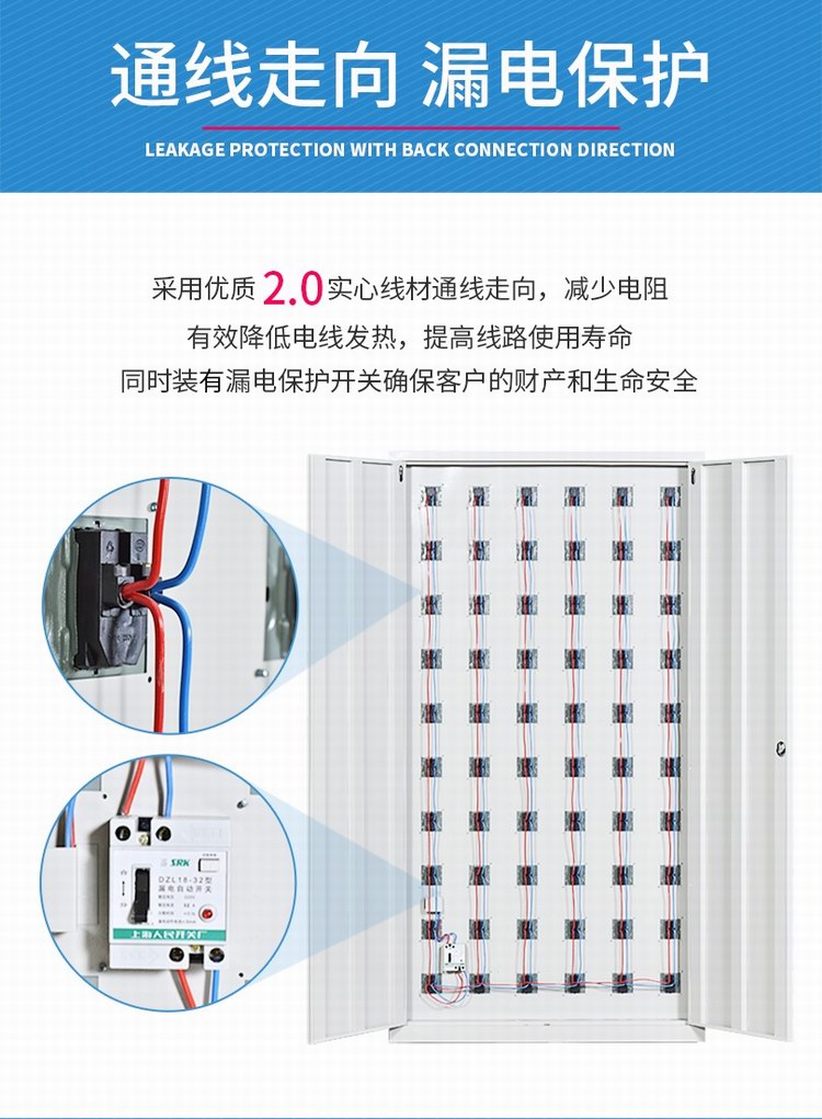 電源線全部采用2.5mm2實心線材,額定電壓為標準生活電壓220V,載荷電流為20A,負載功率為4400W。日常用手機充電功率為10-15W左右,可滿足290部(按15W計算)手機同時充電,而本手機柜可達到門數為100門,電源線材遠遠滿足充電需求;同時具有漏電保護功能,當發生漏電時,能夠及時將電源切斷,保護充電設備安全,需手動復位方可通電,防止因漏電造成電子設備損壞。